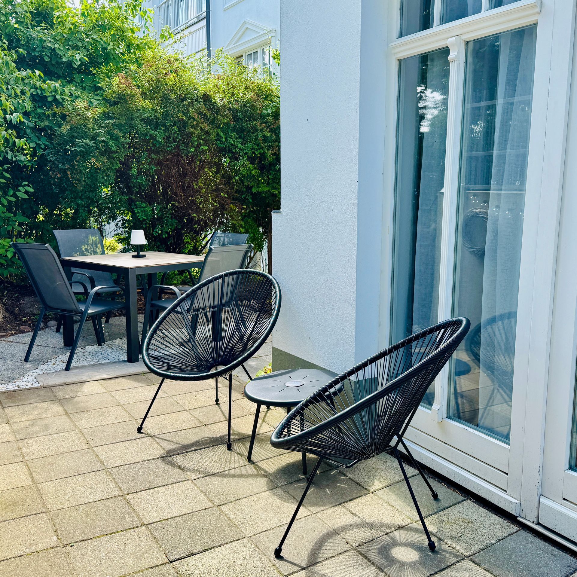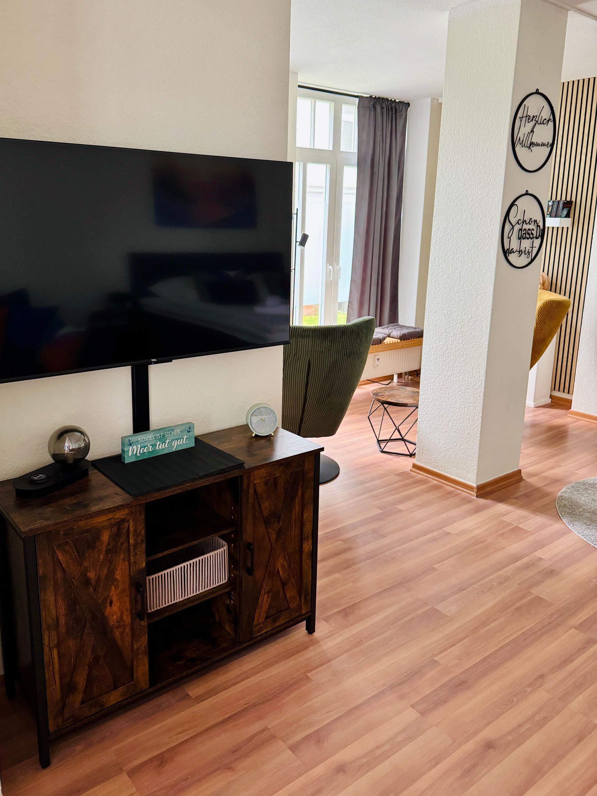 Von der Küche aus erreichst du den lichtdurchfluteten Wohn-, Schlaf- und Essbereich, der Zugang zur großzügigen Terrasse mit Essecke & Entspannungsbereich direkt an der Strandpromenade bietet – ideal zum Sonnen, Entspannen oder einem Glas Wein am Abend.